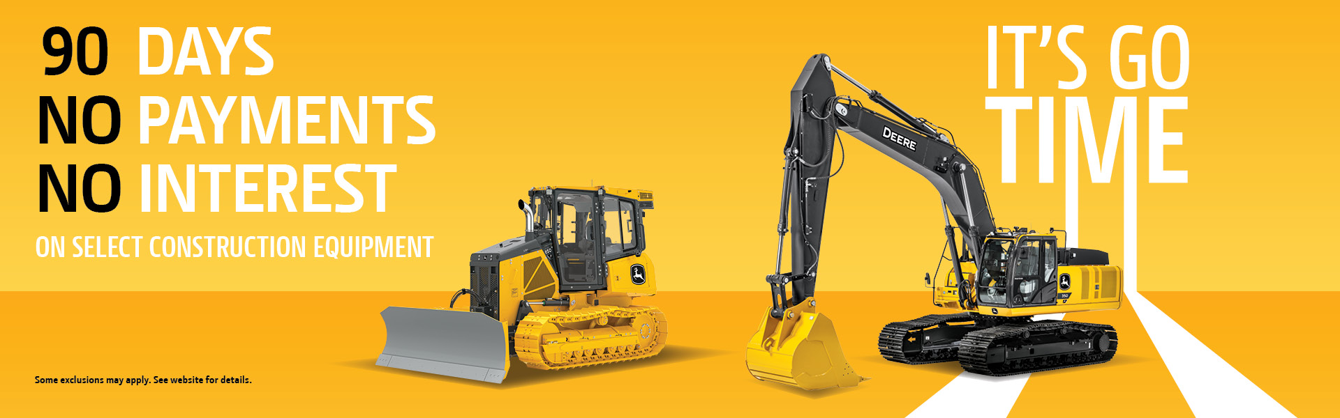 For a limited time, take advantage of 90 days of no payments and no interest, followed by 0% financing on select John Deere Construction Equipment.